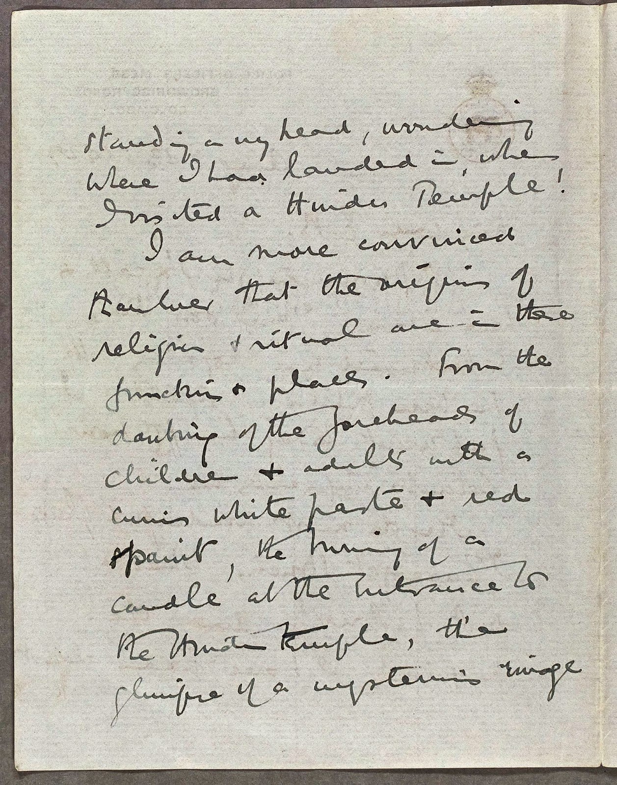 I am more convinced than ever that the origins of religion and ritual are in these functions and places. From the daubing of the foreheads of children and adults with a cumin white paste and red paint, the burning of a candle at the entrance of the Hindu Temple, the glimpse of a mysterious image within, (what is the arc of the covenant and the altar in Christian churches but this?), to the dancing and tom-tom drumming outside, the hullabaloo and general hubbub, we have all that makes for a religion ceremony in the west – only a bit more refined and sophisticated.