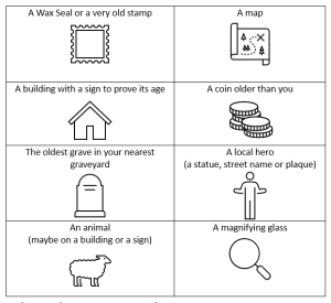 - Take a little trip around your local area to find the items, including a local statue, building with a date on, animal (or animal on a sign) or your local graveyard.